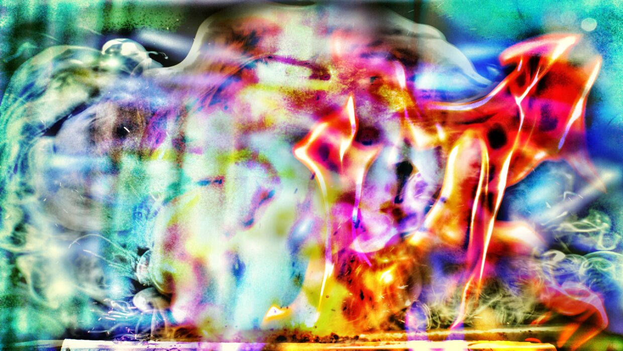 Der von wildesten Träumen bei Vollmond geplagte Künstler W.R. Wolf hat seine lebenslangen Traumtraumata in diesem Gemälde zum Ausdruck gebracht.